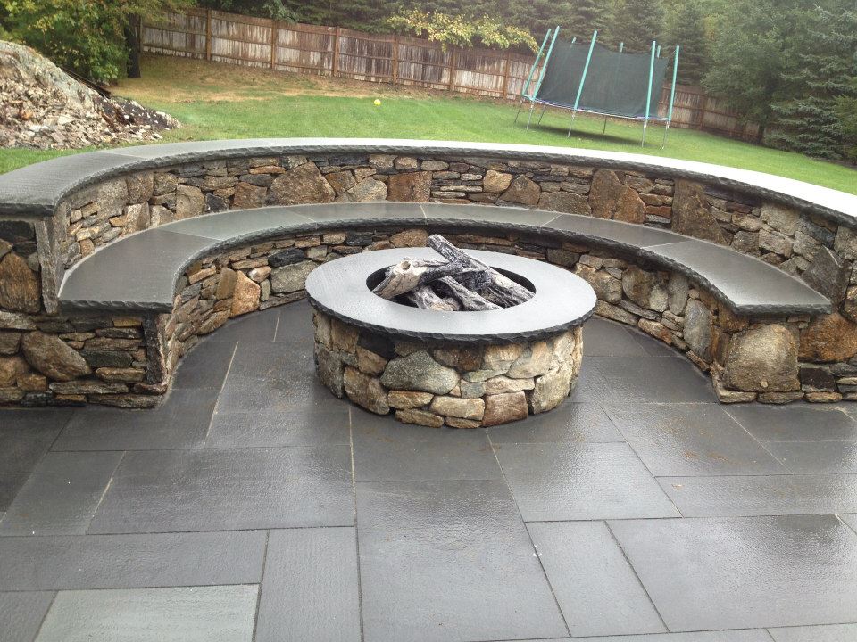 Bluestone Fire Pit Cap : Bluestone patio paving with slot of gray beach pebbles.. Designed by kemora landscapes, the space allows the homeowners the opportunity to hang out together or entertain outside. Bench seating has a wood screen wall that includes lighting & supports vine growth. Bluestone patio paving with slot of gray beach pebbles. If the patio raised above a certain height, building codes may require a safety railing. It is an excellent natural landscaping stone for both residential and commercial applications.